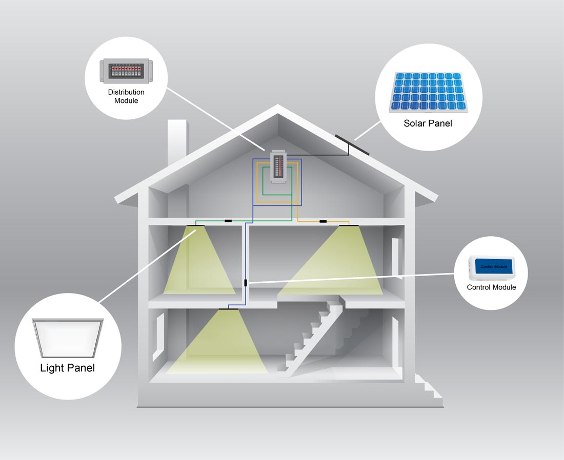 Our multi-systems solution empowers you to create an array of lights from a solitary solar panel. The illume light panels are intricately connected via the control module to the distribution module, also known as the ‘splitter’. The distribution module, linked to the solar panel, efficiently channels the solar panel’s power to each individual light panel.